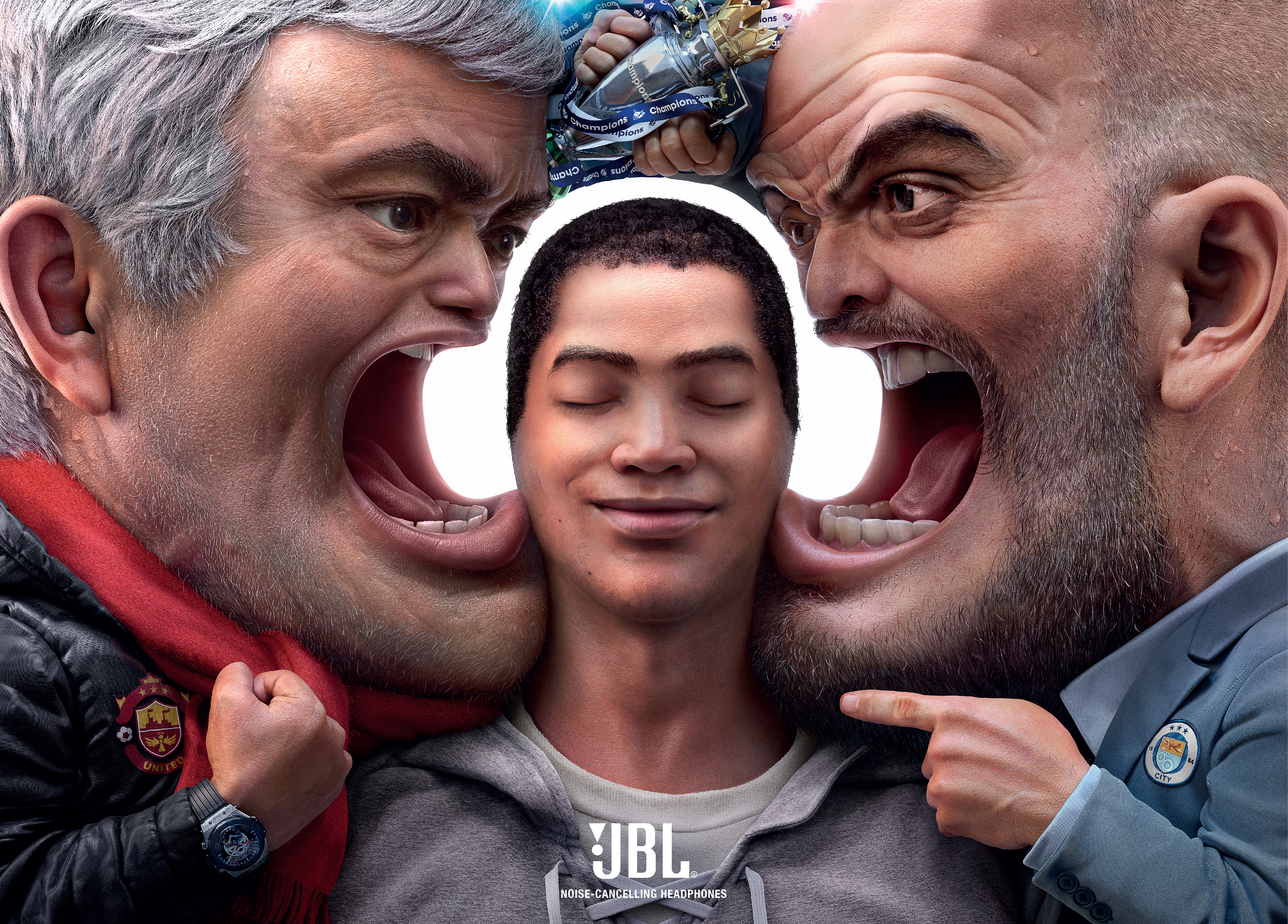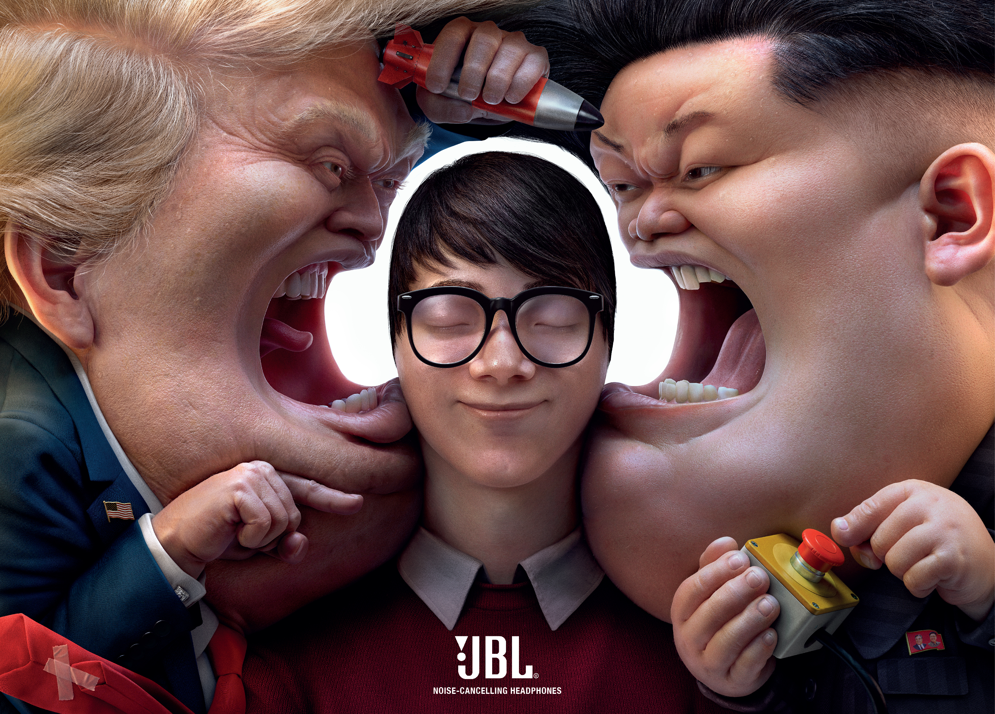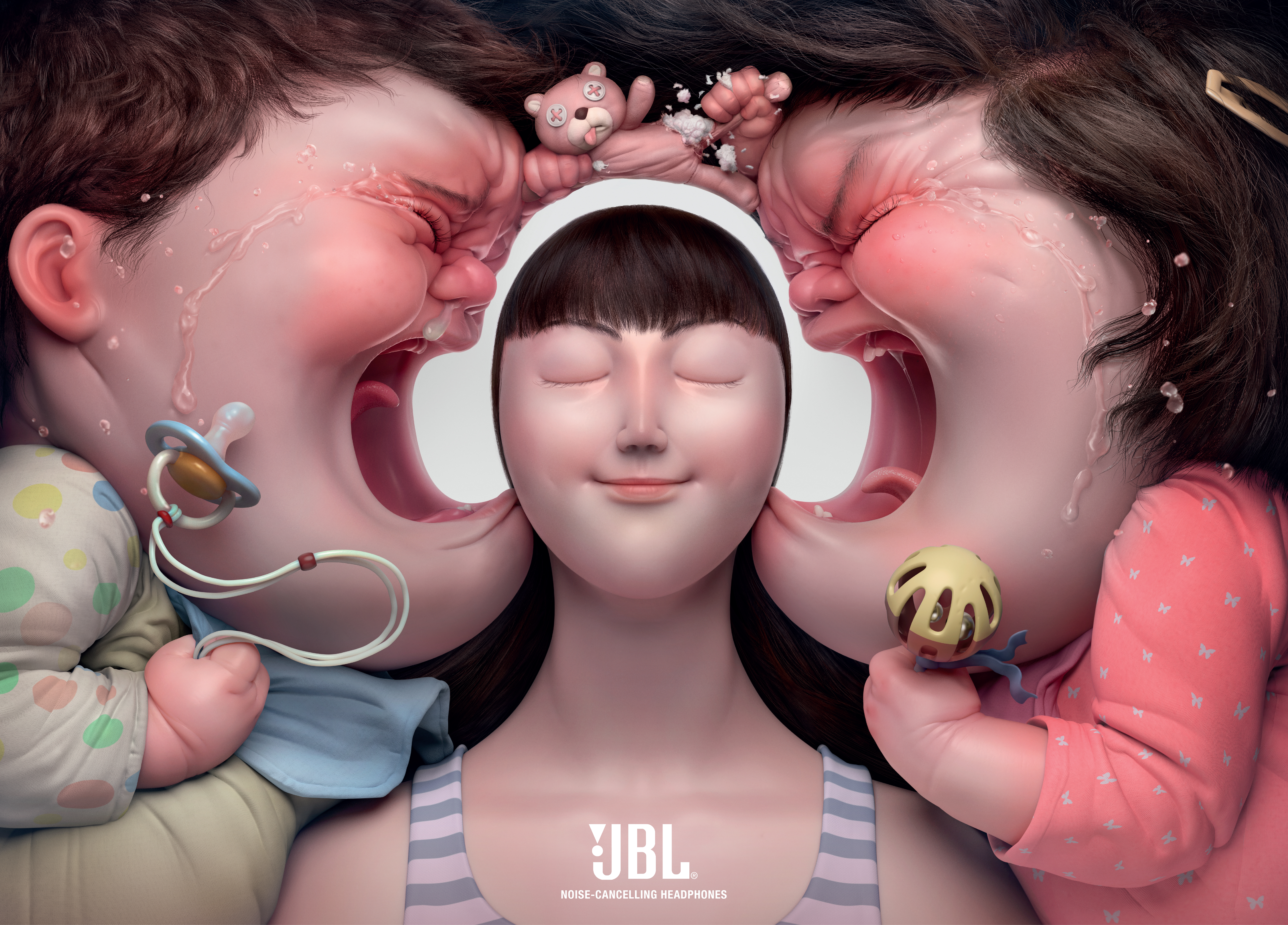 From crying babies to screaming world leaders, our striking compositions conveyed the tension of extreme chaos. The intolerable noise was blocked out with negative space, representing the calming effect of JBL’s noise-cancelling headphones.