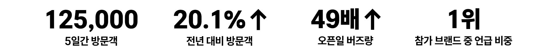 전시 기간 5일 동안 총 124,773명이 방문하여 전년 대비 약 20.1% 증가했습니다. 오픈일 기준 전년 대비 49배 증가한 버즈량을 기록하며, 브랜드 언급 비중 1위를 달성했습니다. 전시 전체의 일관된 스토리텔링과 경험 흐름에 대해 주요 고객사로부터 매우 긍정적인 평가를 받았습니다.